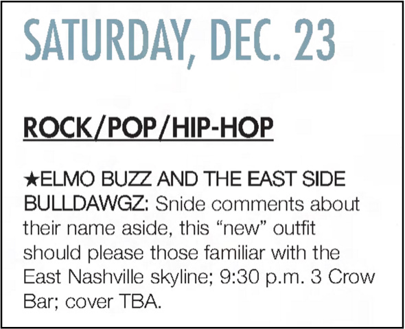 On this day in 2006, Elmo Buzz, Todd Snider’s blue-collar rock & roller alter ego, and his backing band the Eastside Bulldogs gave their first live performance at East Nashville haunt 3 Crow Bar.