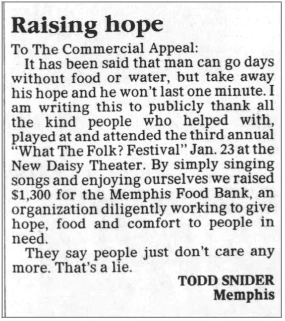 On July 28, 1997, Todd Snider hosted the final “What the Folk” Fest of the 1990s, an event he had been hosting quasi-annually since the early part of the decade.