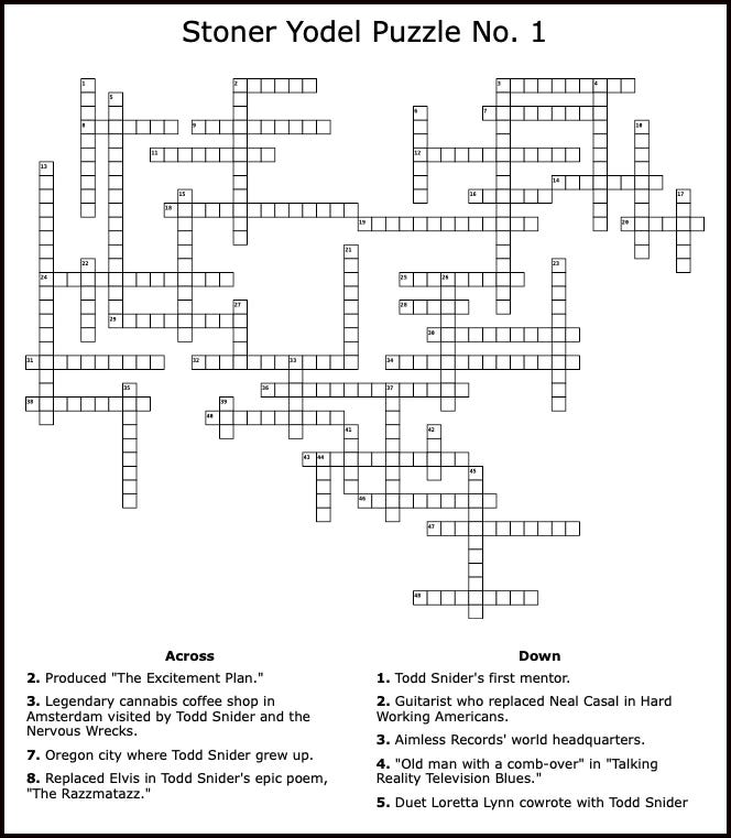 Stoner Yodel Puzzle No. 1A Todd Snider crossword puzzleDaryl SandersAug 18, 2024∙ Paid71ShareBy Daryl SandersHere’s a bit of fun for your Sunday from The Snider Files — a Todd Snider crossword puzzle. This is sort of an experiment, and depending on what the readers think, we might do it again at some point down the road.This post is for paid subscribersSubscribeAlready a paid subscriber? Sign in